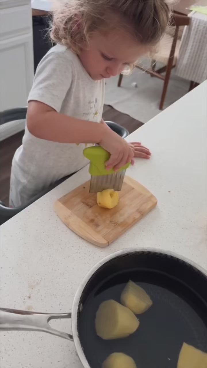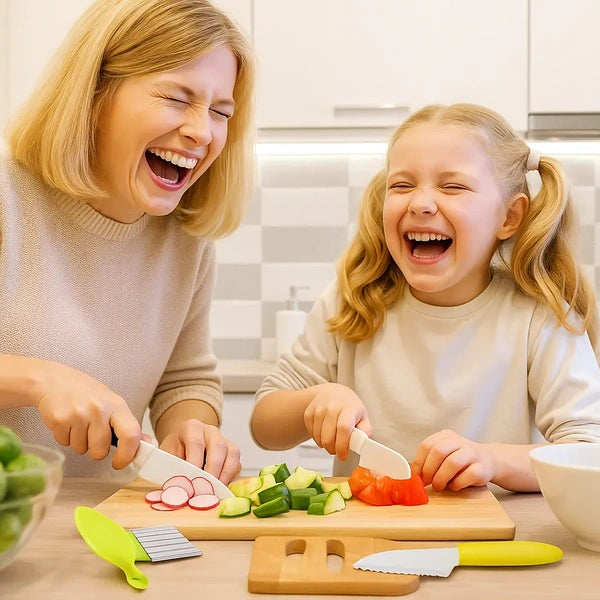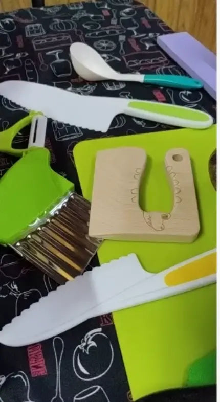 Nous recommandons de commencer avec le couteau en bois pour les plus jeunes, puis de progresser avec les autres ustensiles (comme le couteau ondulĂ© ou lâĂ©plucheur) Ă mesure que lâenfant prend confiance.