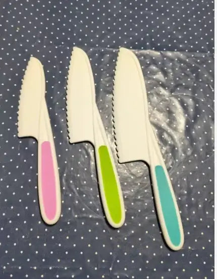 Les lames en nylon sont dentelées et la pointe des couteaux est arrondie pour éviter tout risque de blessure.