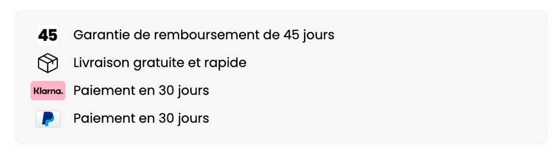 Vous bénéficiez d'une garantie de 45 jours sans risque, qui ne commence qu’à partir du moment où vous recevez le produit !
